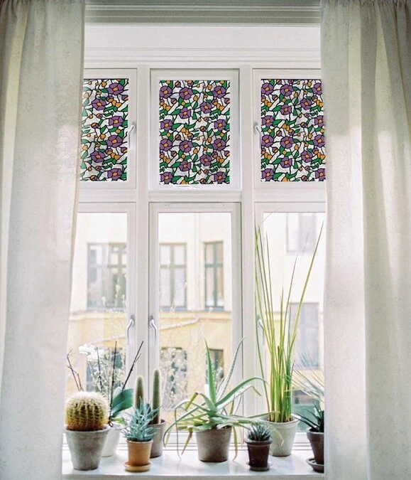 Waarom een saai raamdecoratiefolie kiezen als er zulke leuke te koop zijn? Dit glas in lood folie werkt tegen inkijk én zorgt voor een vrolijk aangezicht van je huis. Bestel het folie eenvoudig op maat óf bestel een kant en klare rol van 15 meter lang.